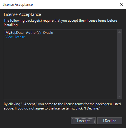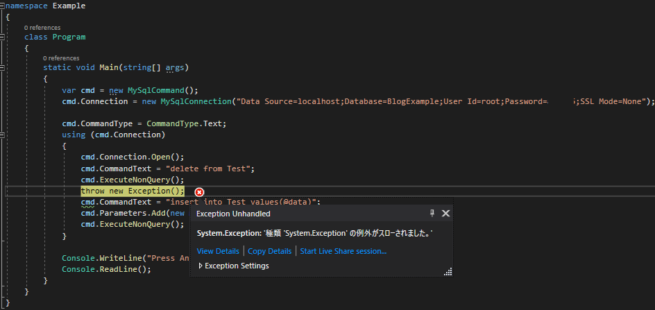 cmd.Connection = new MySqlConnection("Data Source=localhost;Database=BlogExample;SSL Mode=None;User Id=root;Password=");