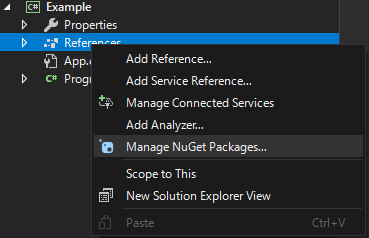 프로젝트에서 References의 항목에서 마우스 오른쪽 클릭을 해서 Context 메뉴를 보면 Manage Nuget 항목이 있습니다.