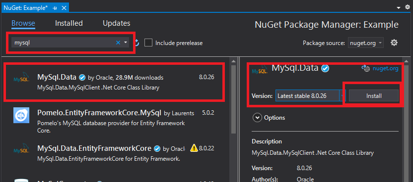 우리는 MariaDB를 사용할 것이기 때문에 MySql.Data 라이브러리를 클릭하고 Version을 확인하고 Install를 누릅니다.