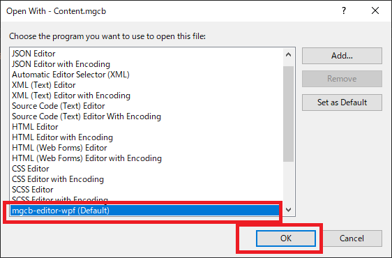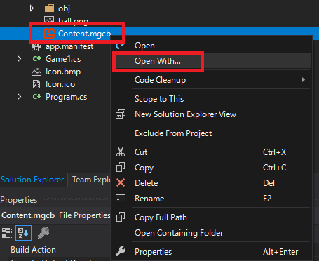 Content.mgcb를 Open with...를 통해서 MGCB Editor를 실행합니다.(Default로 설정했으면 더블 클릭으로 실행됩니다.)