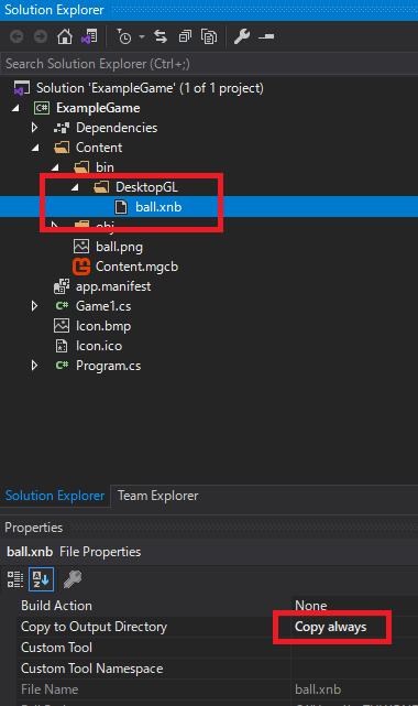 그리고 솔루션 탐색기를 확인하면 xnb파일이 추가된 것을 확인할 수 있는데 Build 후에 파일이 같이 복사가 되도록 Copy always 옵션으로 바꾸어 줍니다.