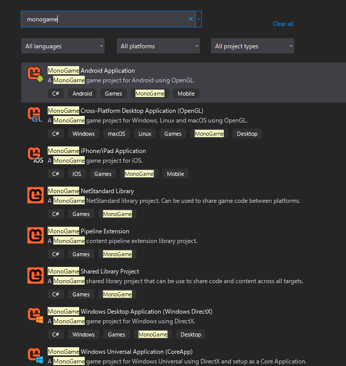 그리고 프로젝트 생성화면에서 기본 템플릿 설정에서 Monogame에 관한 템플릿이 생성된 것을 확인할 수 있습니다.