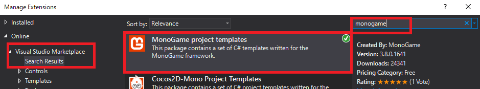 거기서 Monogame을 검색하고 설치합니다.