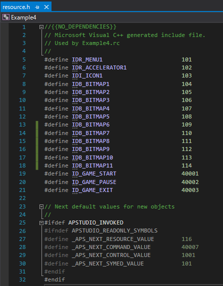 특히 IDB_BITMAP 번호가 중간에 점프 없이 나란히 번호가 생성된 것을 확인합니다.