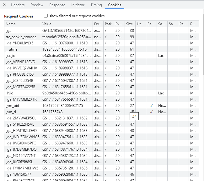 위 이미지에서도 브라우저 개발 모드로 가면 값이 다 보입니다. 그래서 그 값들을 클라이언트(브라우저 유저)에게 보이지 않게 사용하려고 무작위의 유니크 문자열를 생성해서 쿠키 키로 설정하고 서버의 메모리 혹은 파일로 데이터를 보관하는 형태를 세션이라고 합니다.