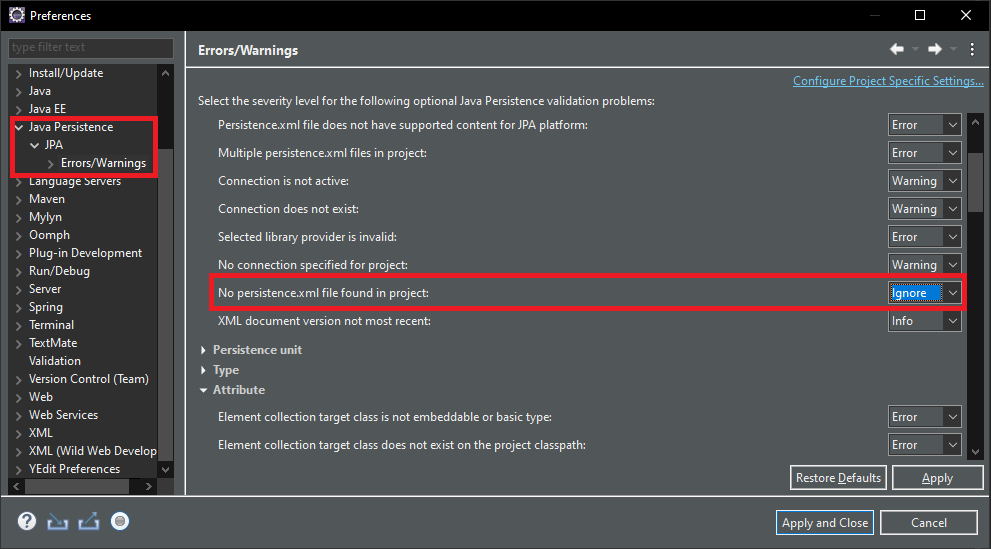Window -> Preferences 탭으로 가서 Java Persistence -> JPA -> Errors/Warnings의 Project -> No persistence.xml file found in project를 ignore로 바꿉니다.