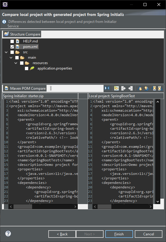 Next 버튼을 누르면 소스 비교 화면이 나오는데, 여기서 pom.xml만 변경하는 것으로 체크하고 Finish 버튼을 누르면 maven 업데이트가 됩니다.