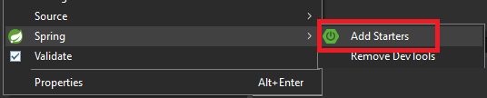프로젝트에서 마우스 오른쪽을 눌러 Spring의 Add Starter를 실행합니다.