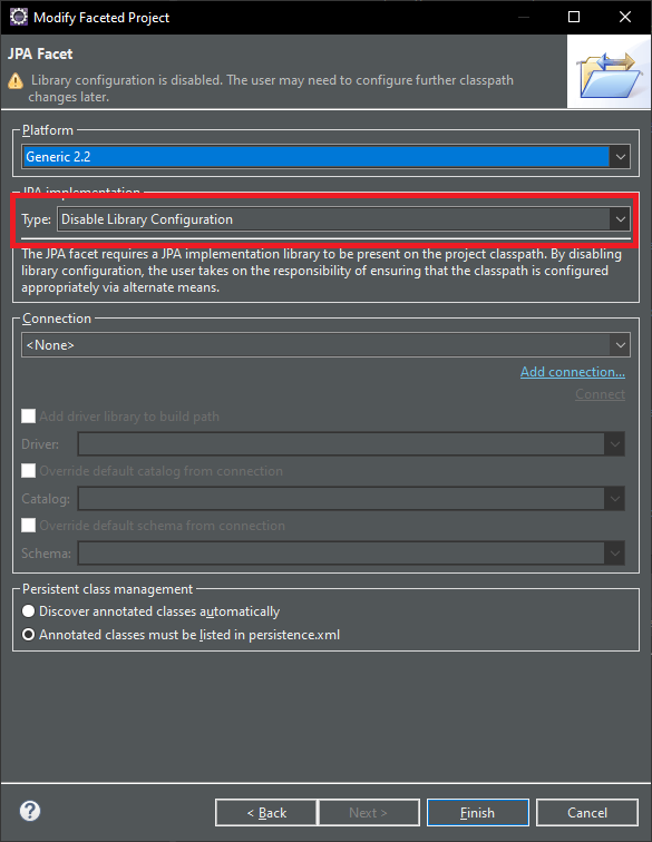 그리고 이게 이클립스 버그인지는 모르겠는데.. 기존에 선택한 것이 선택이 되지 않았습니다. 그래서 선택하지 않고 Finish를 누르고 설정하게 되면 기존에 설정한 라이브러리가 빠지는 현상이 발생하네요.
