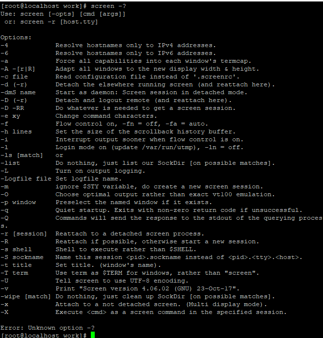 여러가지 옵션이 있습니다만, screen에서 사용하는 옵션은 세션 열기, 닫기, 접속하기, 끊기, 그리고 screen list 확인하기가 전부입니다. 그 외에는 저도 사용해 본 적이 없습니다.