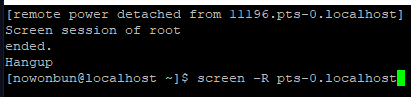 Detached로 바뀌었습니다. 그럼 screen 세션에 접속되어 있는 터미널은 튕겨져 나옵니다.