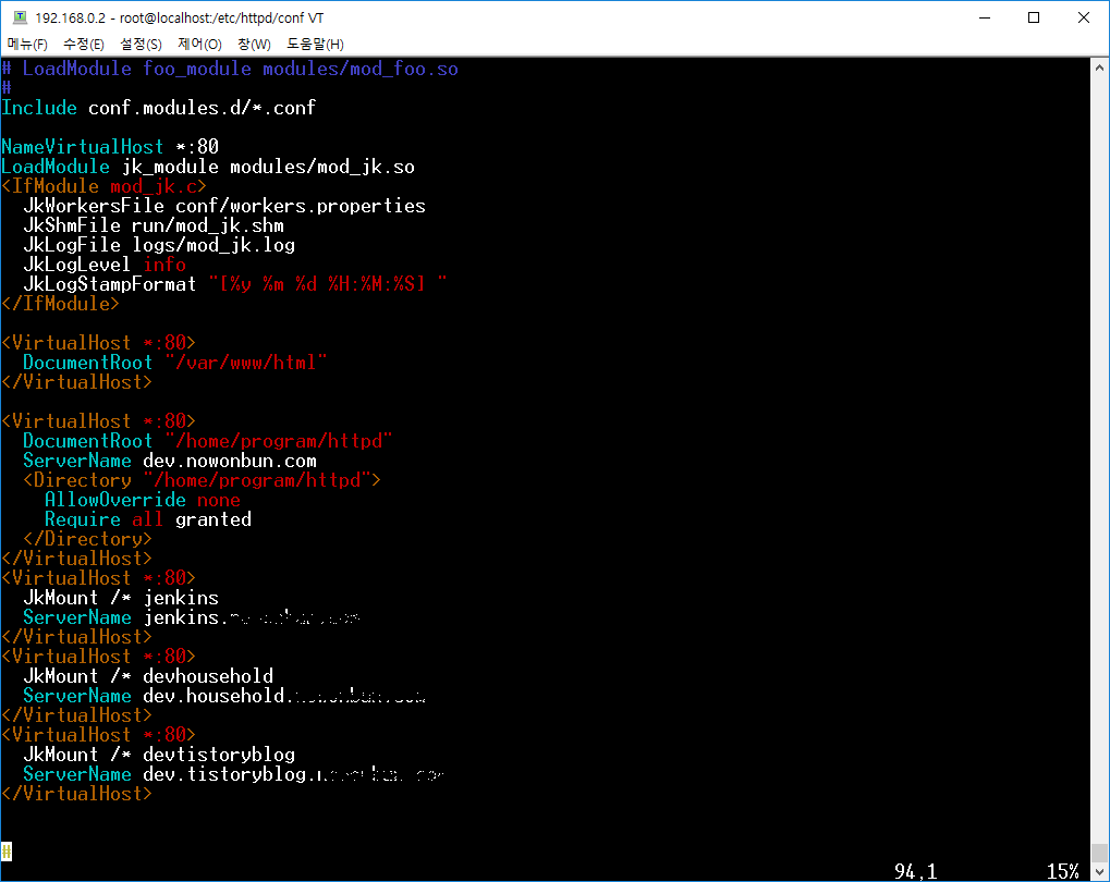 그러나 저는 서버 안에 jankins와 웹서버를 불리하고 jsp와 php를 혼재해서 프로그래밍을 하는 스타일이기 때문에 apache의 virtual host 기능이 필요하므로 tomcat 한개 서버를 돌리기 보다는 여러개의 tomcat을 하나의 apache로 묶어서 호스트 이름별로 분산하는 기능으로 많이 사용합니다.