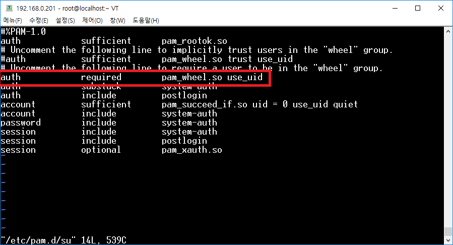 편집기로 확인하시면「auth required pam_wheel.so use_uid」부분이 #으로 주석처리 되어 있습니다. 이 부분을 주석 해제합니다.