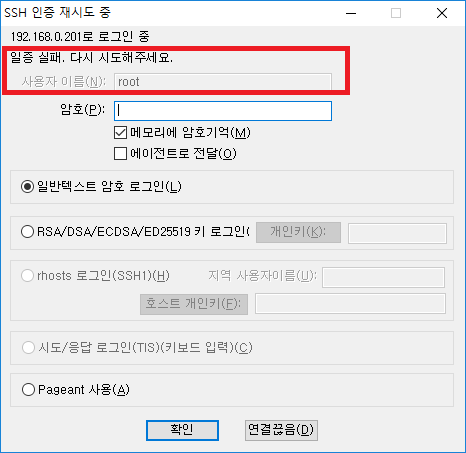 root로 접속을 시도했으나 인증 실패가 나오네요..(테라텀에서 일증 실패라고 나오네요.. 오타...ㅎㅎ)