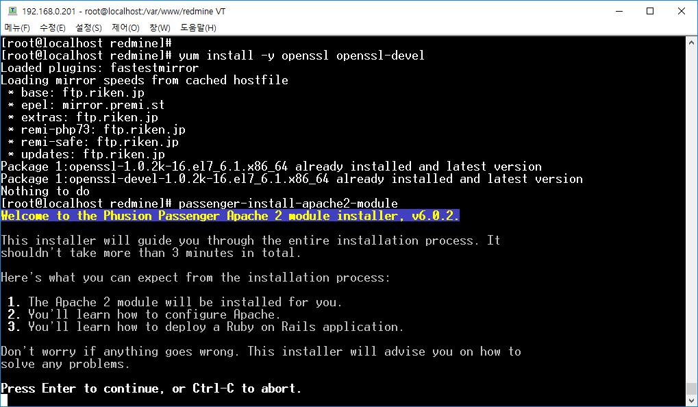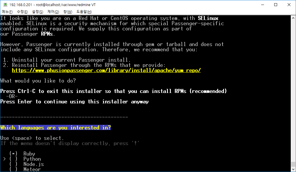 Ruby는 설치했는데 Python은 설치를.. 안했는데.... CentOS이니깐 기본적으로 설치되어 있을 거라 믿고 두 개 선택해서 엔터를 칩니다.