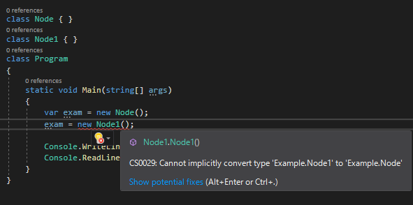 위 예제의 결과를 보면 node의 변수와 node1의 변수의 차이는 소스 상에서 작성만 Node의 클래스 타입에서 var로 바뀌었을 뿐, 프로그램 상에서 흘러가는 처리에 대해서는 똑같습니다.