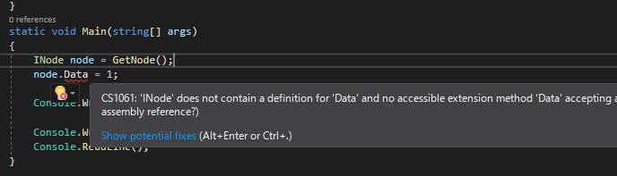 뭐, 당연한 것입니다. 그렇다면 데이터 타입을 INode를 var로 바꾼다고 해서 Data를 사용할 수 있을 것 같지만, GetNode함수에서 INode로 반환을 하기 때문에 결국에는 같은 에러가 발생합니다.