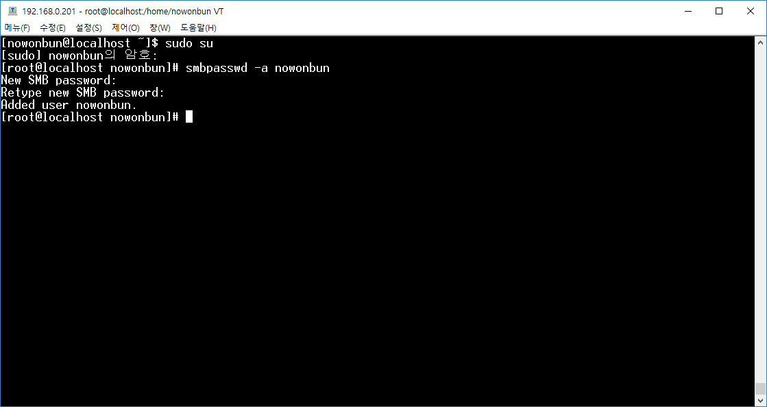 그리고 삼바 비밀번호 설정하겠습니다. 이 비밀번호는 서버를 접속하는 비밀번호와 다릅니다.