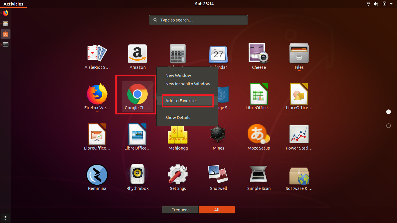 설치가 완료되면 런처(화면 왼쪽 아래)를 클릭하면 크롬이 설치되어 있는 것을 볼 수 있습니다. Add to Favorites를 클릭하여 Dock에 고정시킬 수 있습니다.