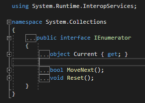 그리고 IEnumerator의 경우는 foreach에서 사용될 패턴의 동작 인터페이스로 현재 값에 대한 프로퍼티 Current, 포인트 이동과 값이 존재하는 지에 대한 함수 MoveNext, 그리고 포인터의 초기화를 하게 되는 함수 Reset로 이루어져 있습니다.