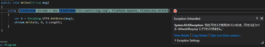 (일본어로 표시되지만 뜻은 다른 프로세스에서 파일이 사용중이여서 액세스할 수 없습니다라는 뜻입니다.)